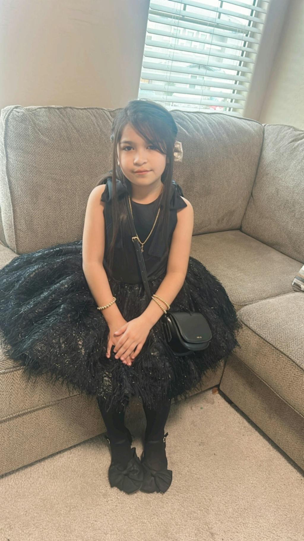 • Black tulle skirt with feathered top layer